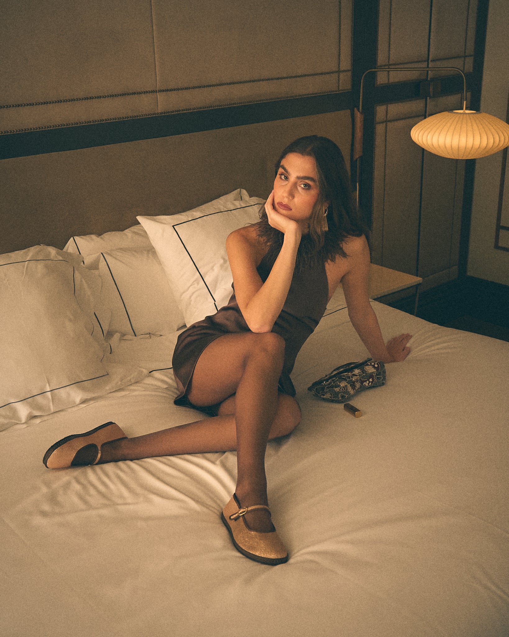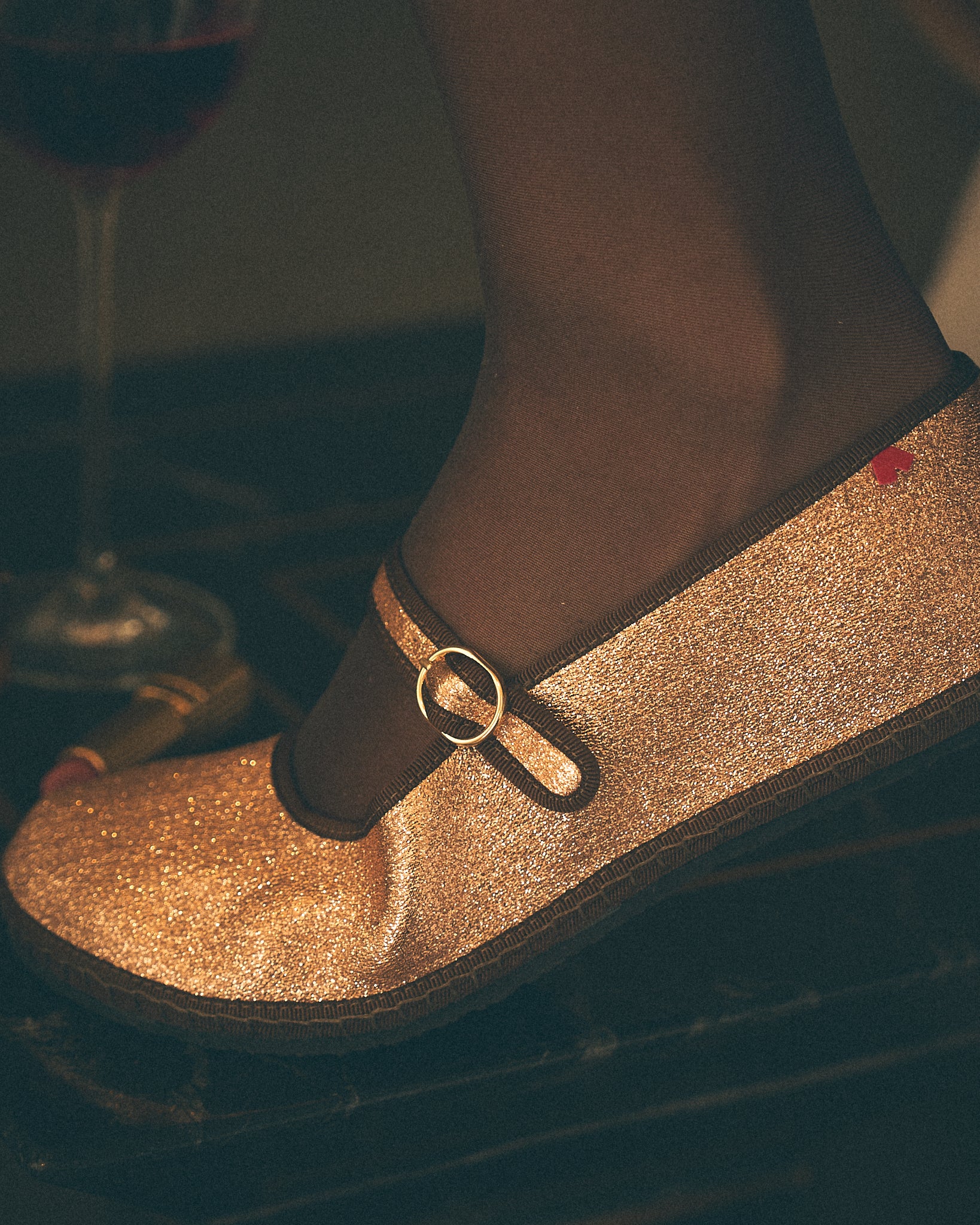Las Mary Jane Bronzo están inspiradas en los reflejos dorados del atardecer veneciano. Su acabado brillante en tono ámbar-bronce aporta una sofisticación cálida, que se equilibra con el ribete marrón para un look atemporal y con carácter.